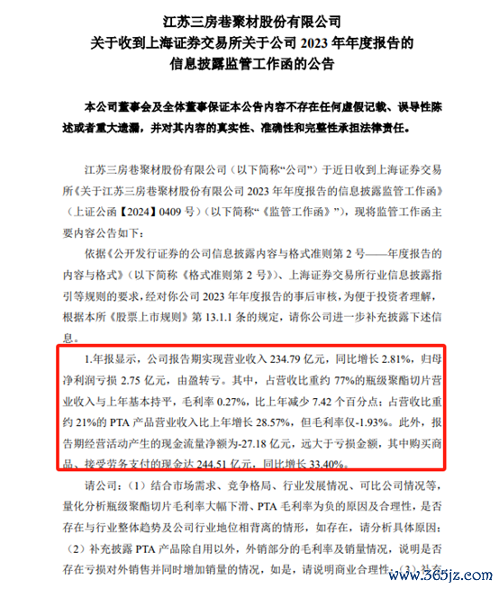 一是,2023年年报显示,三房巷公司报告期实现营业收入234.79亿元,同比增长2.81%;归母净利润亏损2.75亿元,由盈转亏。其中,占营收比重约77%的瓶级聚酯切片营业收入与上年基本持平,毛利率0.27%,比上年减少7.42个百分点;占营收比重约21%的PTA产品营业收入比上年增长28.57%,但毛利率仅-1.93%。