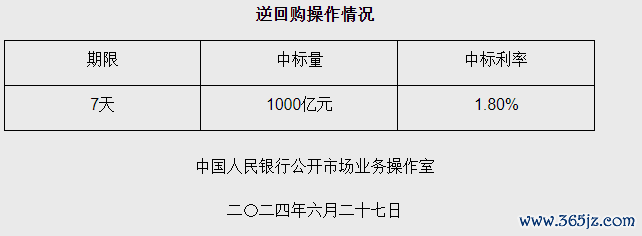 【大河财立方消息】为维护半年末流动性平稳,2024年6月27日,中国人民银行以利率招标方式开展了1000亿元逆回购操作证券公司杠杆,中标利率1.80%,与此前持平。因今日有200亿元7天期逆回购到期,实现净投放800亿元。