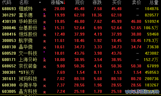 半导体板块盘中再度走强,截至收盘,锴威特、富乐德20%涨停,台基股份涨超15%再创新高,文一科技、上海贝岭等均涨停。