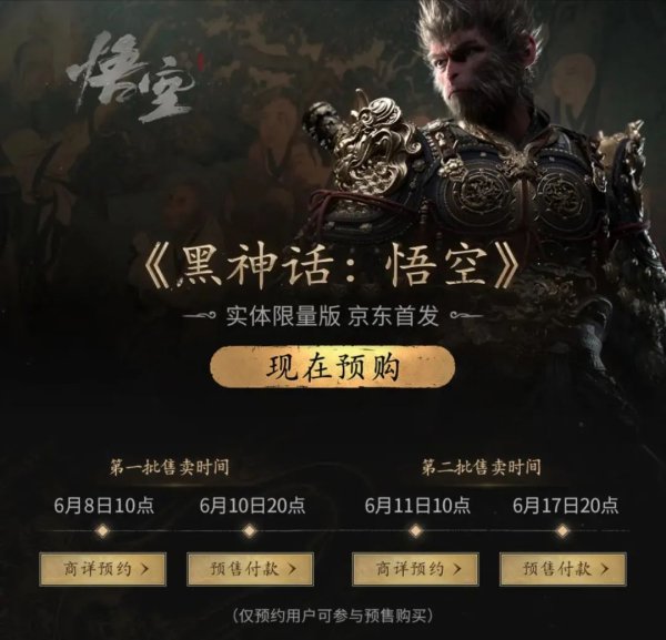 还有2个月,今年最受瞩目的国产游戏《黑神话:悟空》,将迎面撞上自己的命运。 6月10日晚,《黑神话:悟空》再次展示了自己“泼天的流量”。 一“猴”难求 6月10日,《黑神话:悟空》实体版在京东平台正式开启全款预售。 来源:京东 据悉,此次推出的实体典藏版全球限量发售仅1万套,售价1998元,每套都附有独特的设计和精美的包装以及一系列珍贵的收藏品,如限量版手办、艺术画册等,旨在满足玩家对游戏深度体验...